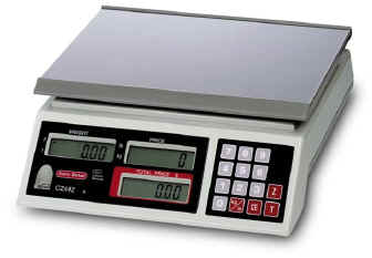 LCD displays for weight, price per pound, and total price. The simple keypad