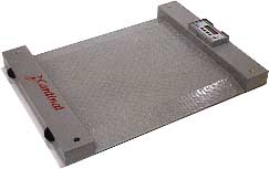 Comes complete with built-in weight indicator and wheels. Uses (4) 500 lb shear beam load cells. Overall dimensions: 30" L x 40" W x 4.5" H. Platform dimensions: 30" L x 30" W. Construction: heavy duty checkered steel plate with powder paint, lifting handle and integral wheels. Shipping weight: 105 lbs.